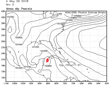 Figura 3. Mapa promedio de presión atmosférica al nivel del mar del día 26 de mayo del 2018. Fuente http://www.esrl.noaa.gov