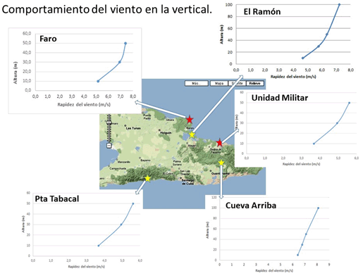 La figura 9 muestra el comportamiento del perfil vertical del viento medio en la capa superficial atmosférica sobre algunos puntos de la región oriental incluyendo las zonas montañosas. En la misma puede apreciarse que en la costa norte se obtienen los valores medios de rapidez del viento más alto de la región. Se observa además el incremento de la rapidez del viento en la montaña de Cueva Arriba, ubicada a más de 700m sobre el nivel del mar, como ejemplo de la influencia de la montaña en el perfil vertical del viento.
